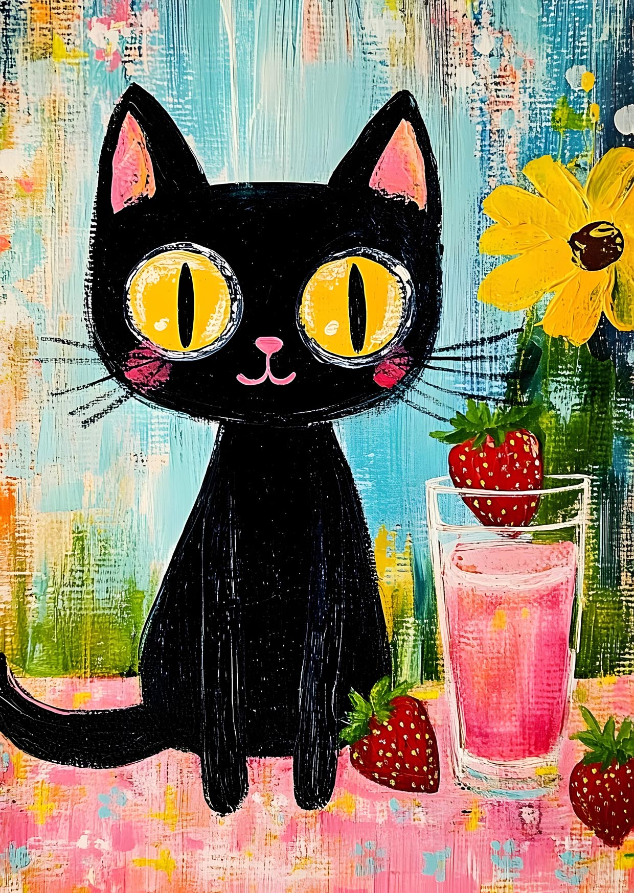Fresh, fruity, and full of feline charm — Berry Bright captures a wide-eyed black cat enjoying a perfect summer moment beside a glass of strawberry milkshake. Splashed with bold brushstrokes of aqua, rose, and sunshine yellow, this playful giclée art print radiates joy and whimsy.