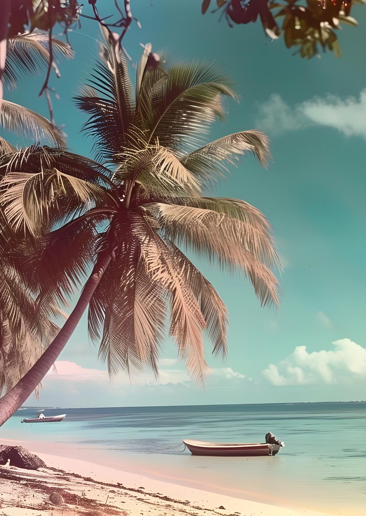 The composition draws your eye through layers of calming detail: gently swaying palms arch overhead, their fronds diffusing the sunlight into soft, nostalgic hues. A small boat rests at the water’s edge, embodying the quiet invitation of an unhurried day. The stillness of the sea, rendered in tranquil gradients of turquoise and misty teal, completes the atmosphere of escape.
